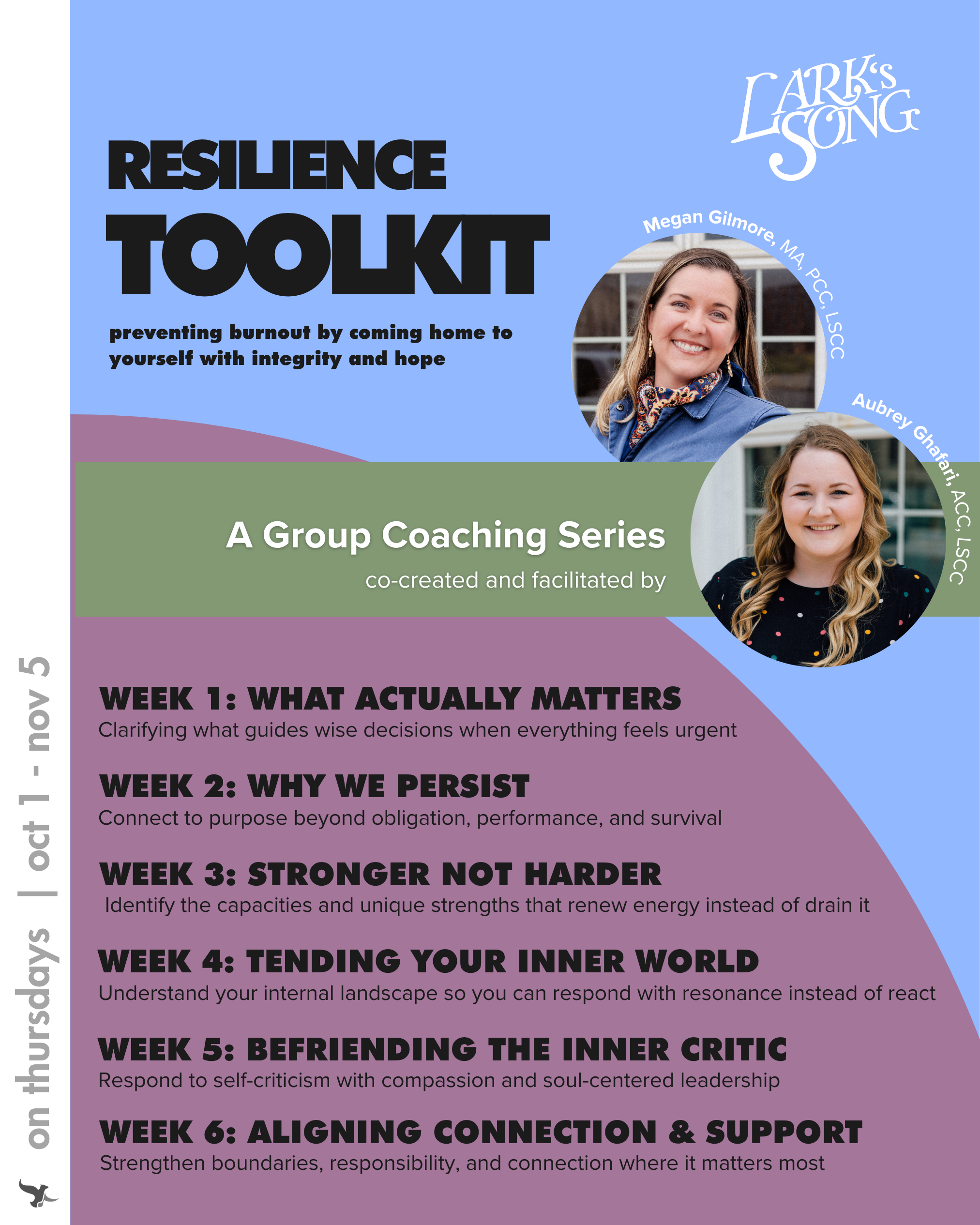 The RESILIENCE TOOLKIT is a group coaching series designed for those that helps you reconnect with what matters most, strengthen your inner foundation, and realign how you show up in your life and relationships.